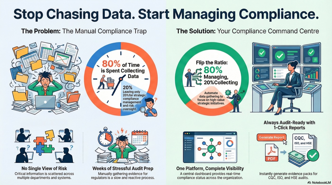 One-click evidence packs for any audit framework â CQC, ISO, HSE, and more.