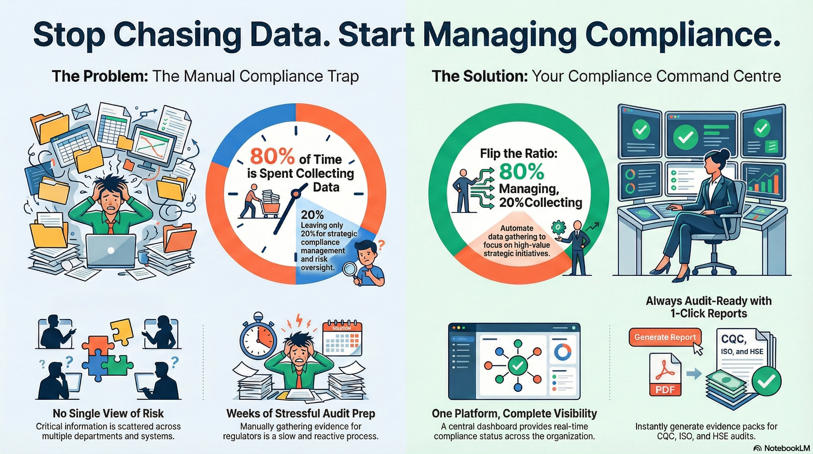 - Compliance officers spend too much time collecting data from different departments and systems, leaving little time for actual compliance management. Manual processes make it hard to demonstrate continuous improvement or prepare for audits efficiently.