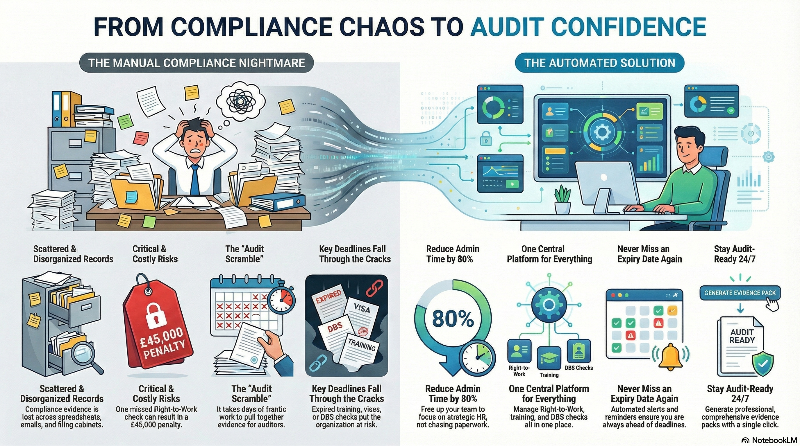 - UK HR teams must manage right-to-work verification, training records, DBS checks, policy acknowledgements, and maintain evidence for regulators like CQC and Ofsted. Without automation, these tasks consume hours of admin time and risk gaps that could lead to fines or failed audits.
