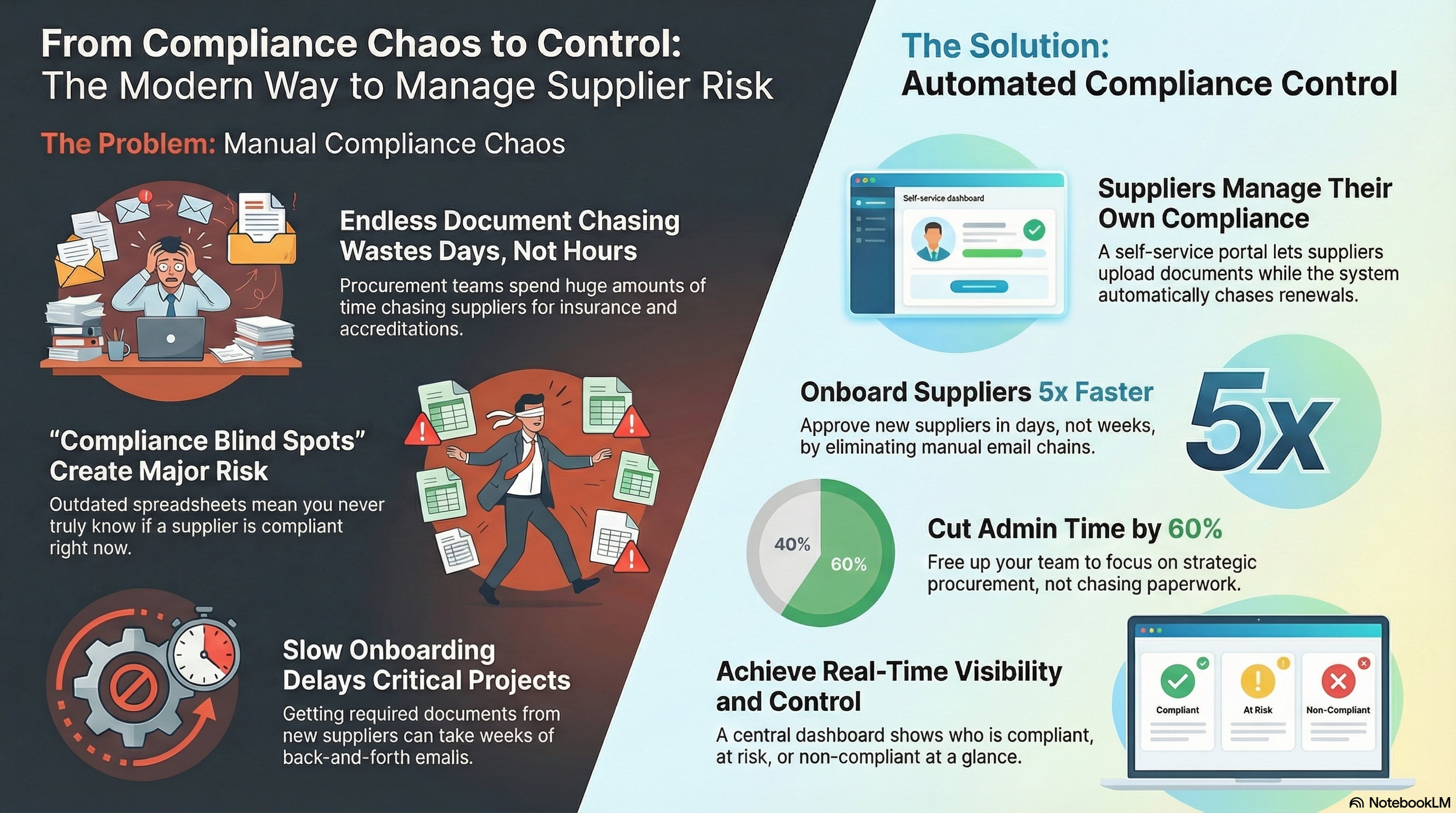 - With Compliance Cover, supplier onboarding that previously took weeks of email chasing can be completed in days. Suppliers receive a link to a self-service portal, upload their documents, and the system validates everything automatically.